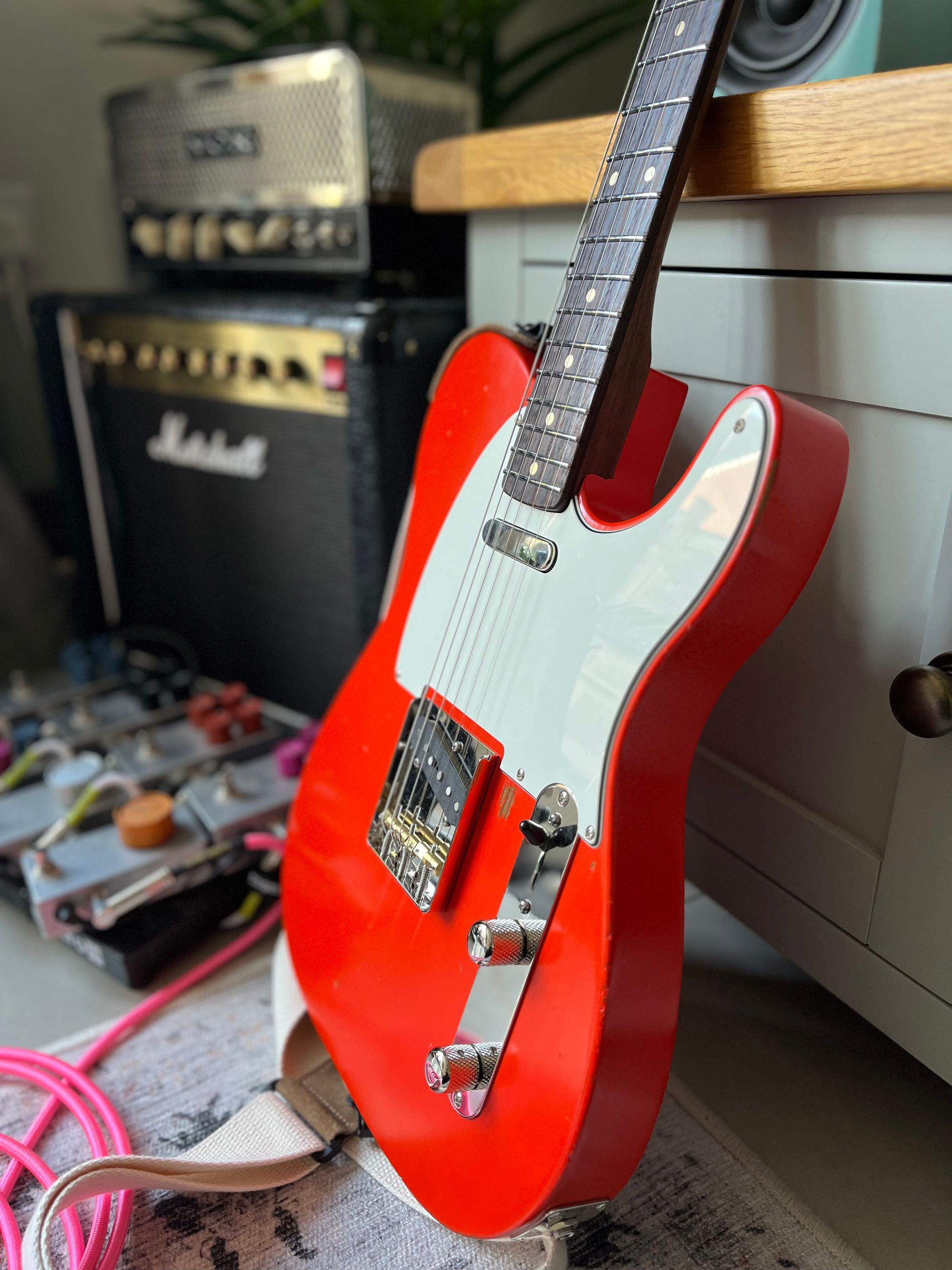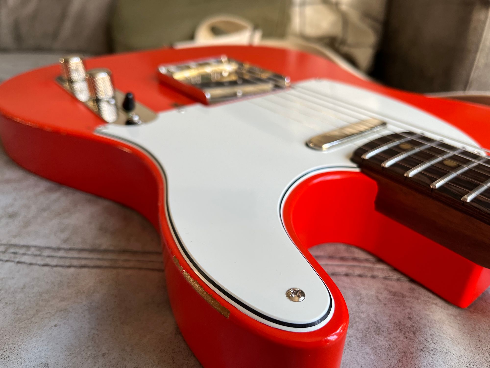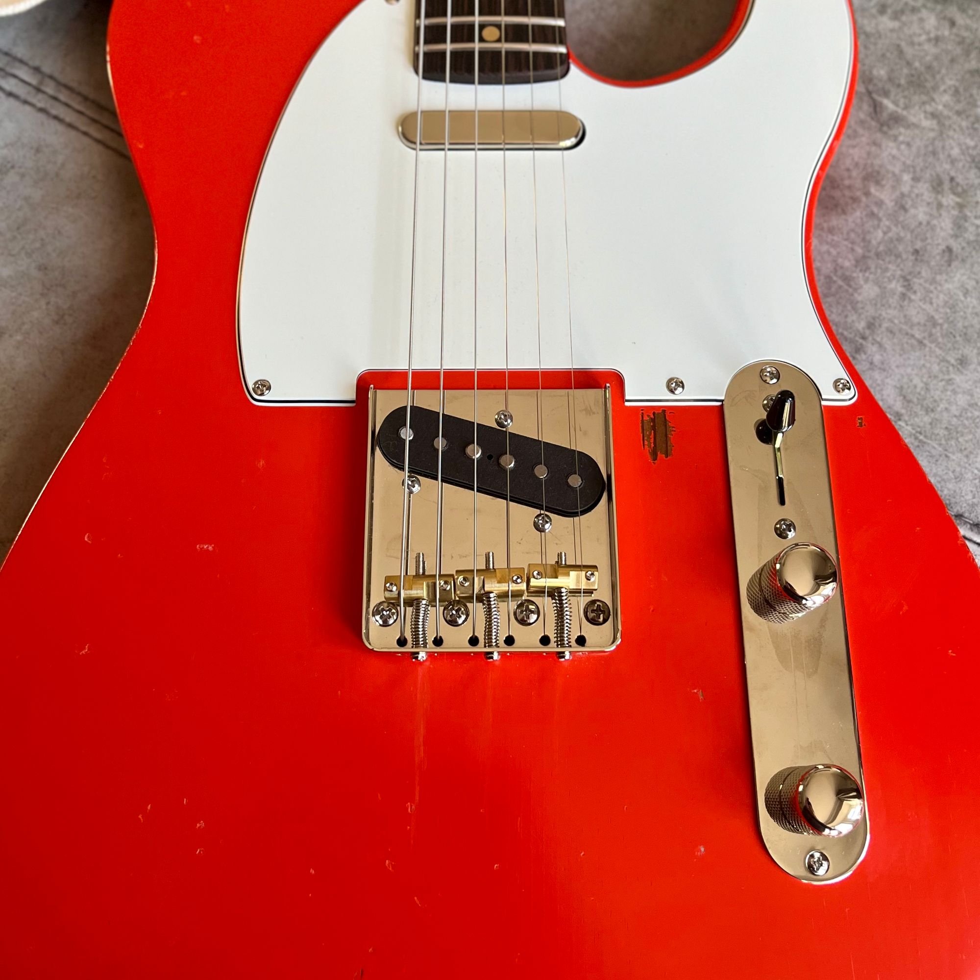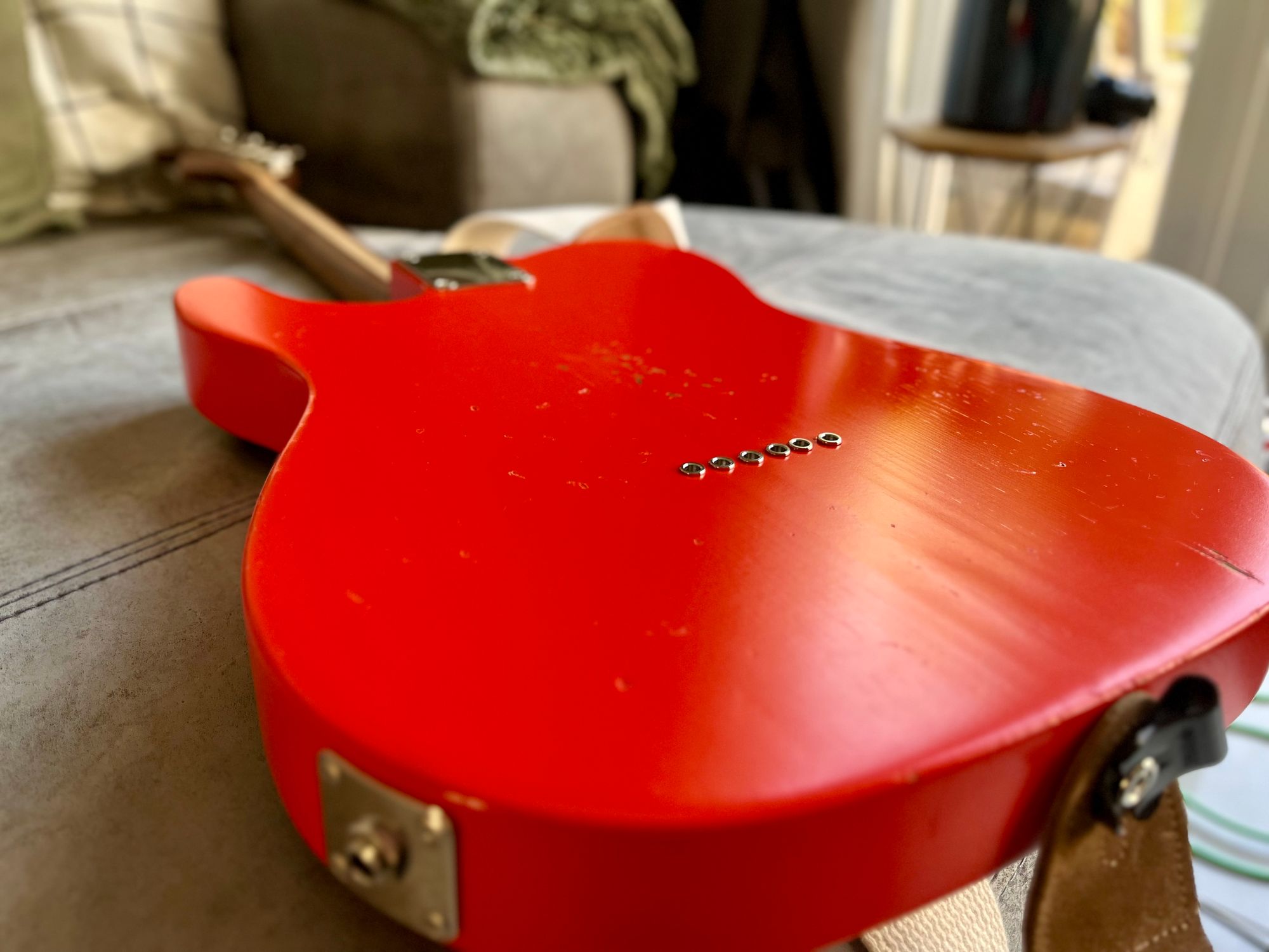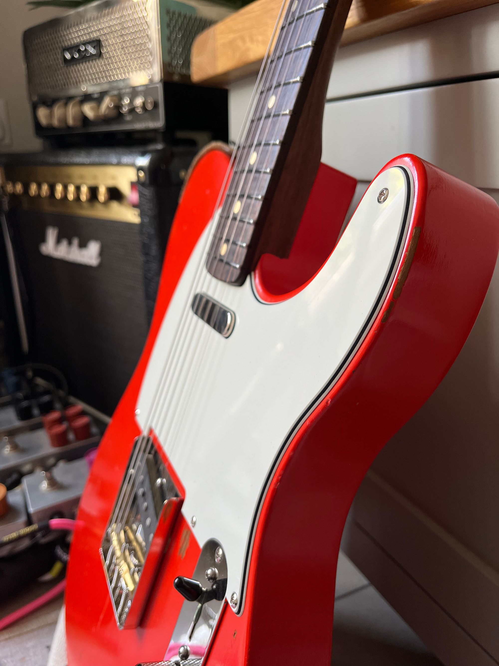 Body: Roasted pine, thin satin nitro, Fiesta Red, road-worn
